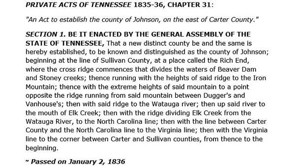 On January 2, 1836, the Tennessee State Assembly officially established Johnson County, located to the east of Carter County. The county was named in honor of early pioneer Thomas Johnson. While the county seat was not yet determined, it was decided that it would be named Taylorsville, after Colonel James P. Taylor. This name was later changed to Mountain City in 1885.
