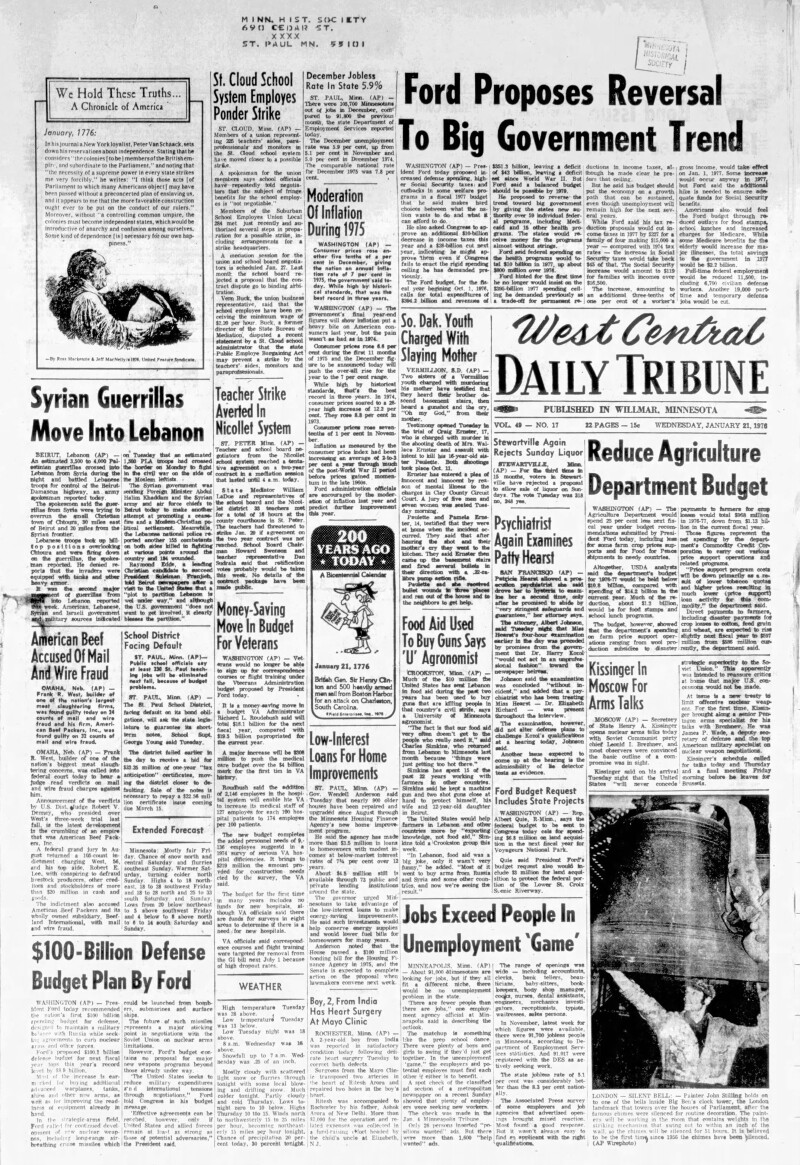 The front page of the West Central Tribune on that Wednesday revealed a range of pressing issues. Among the major headlines was President Gerald Ford’s proposal to reverse the trend toward increased government intervention. In the context of the ongoing Cold War, Ford’s administration was addressing a significant $100 billion defense budget plan. This proposal aimed to bolster national security as tensions in the Middle East escalated, particularly with Syrian guerrillas moving into Lebanon.