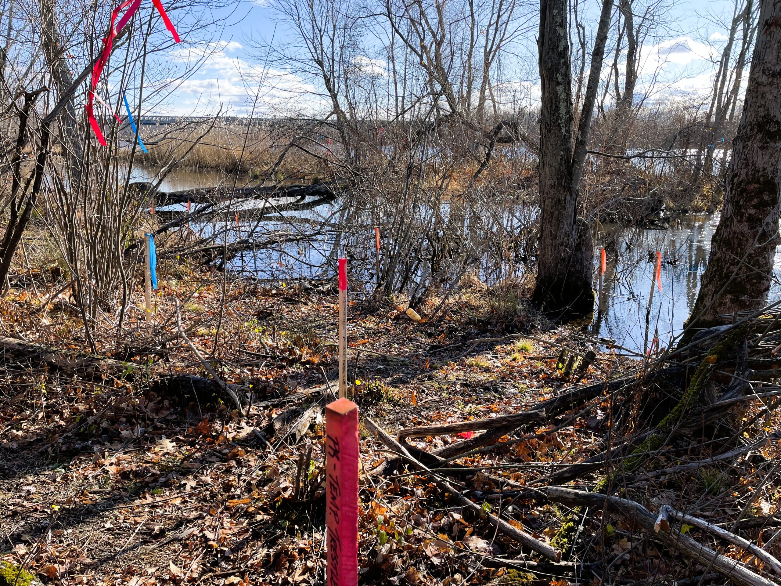 As of January 2024, site work is in full swing, with crews marking various locations with orange construction barrels and flags. These markers indicate wetland boundaries, clearing limits, and erosion controls, as confirmed by John Goggin from the Massachusetts Department of Transportation. The construction site is located near an abandoned lift station, where survey teams are actively working to prepare for the upcoming phases of the project.