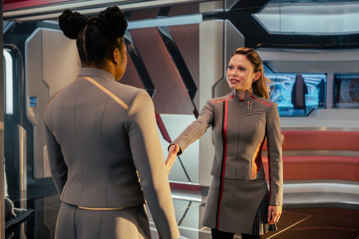 The Dar-Sha differ from other iconic alien races in the “Star Trek” universe, such as the Romulans and Vulcans, with their distinctive facial ridges and lack of eyebrows. Genesis Lythe, a determined cadet at the newly reopened Starfleet Academy, strives to establish her own identity separate from her admiral mother. “There are so many things about Genesis that I love so much,” said Shepard. “She’s very layered: dynamic, confident, strong and smart, but under all that, she’s got a lot of insecurities. She’s still young and figuring out life.”