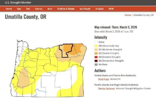 UPDATE: Umatilla County has officially declared a drought as of March 4, 2023, following a significantly drier winter. The entire county is now under a moderate drought, with approximately half facing severe drought conditions, particularly on the eastern side, according to the latest assessment from the U.S. Drought Monitor.
